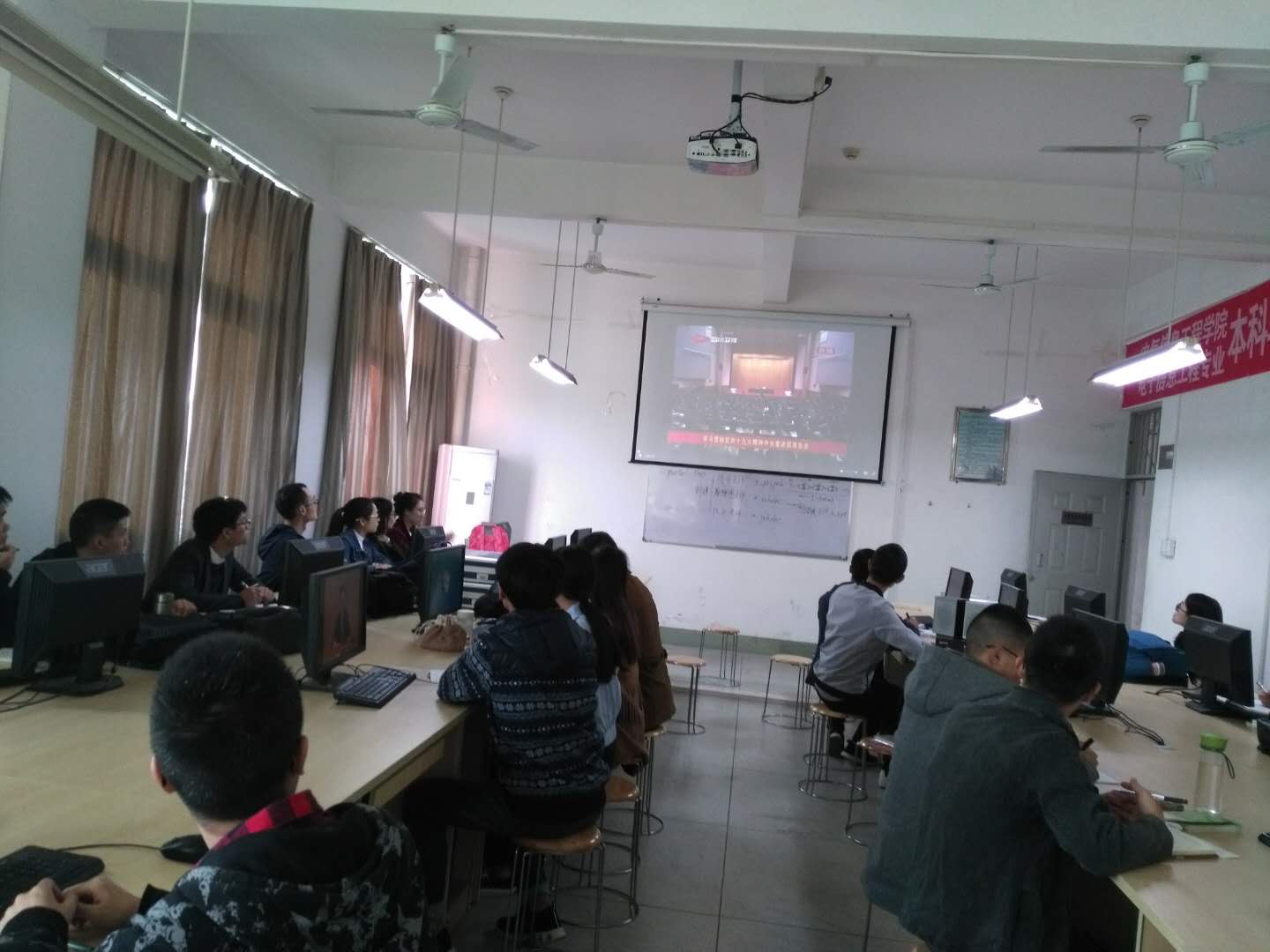 师生在专业实训室观看直播