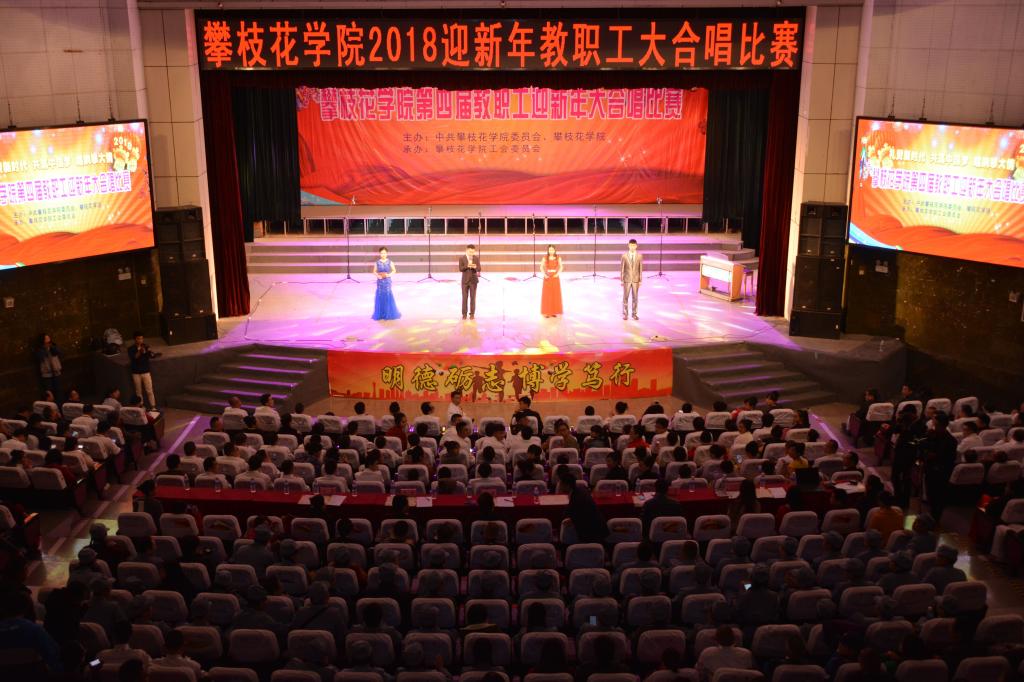 为庆祝党的十九大,喜迎新时代,开启新征程,担当新使命,1229日下午,我校在会堂举行以“礼赞新时代 共筑中国梦 唱响攀大情”为主题的2018迎新年教职工大合唱比赛。各二级学院及机关部门共同组成的15支队伍参与比赛,校领导和各参赛人员及师生代表千余人观看了比赛。