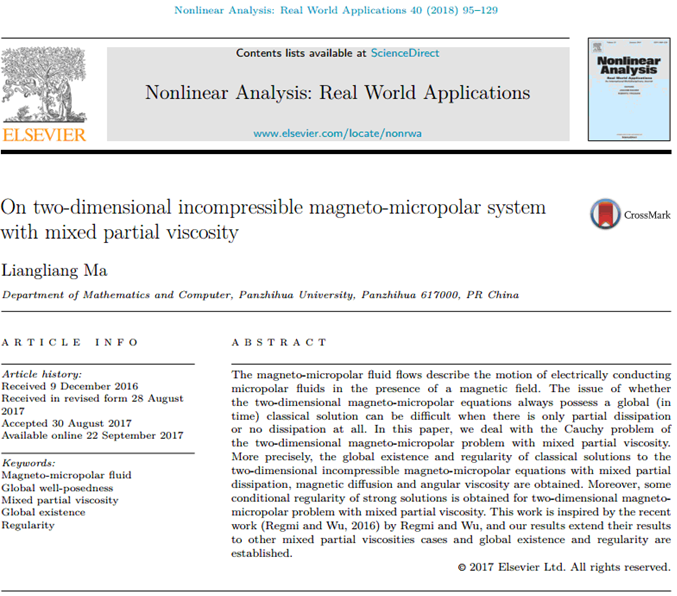 记者今日获悉,以我校为独立单位、数学与计算机学院教师马亮亮为独立作者完成的《On two-dimensional incompressible magneto-micropolar system withmixed partial viscosity》发表于《Nonlinear Analysis: RealWorld Applications》(影响因子: 2.268;中科学院分区: 1区)。该研究探讨了含有混合部分黏性的二维磁微极流系统的整体正则性。