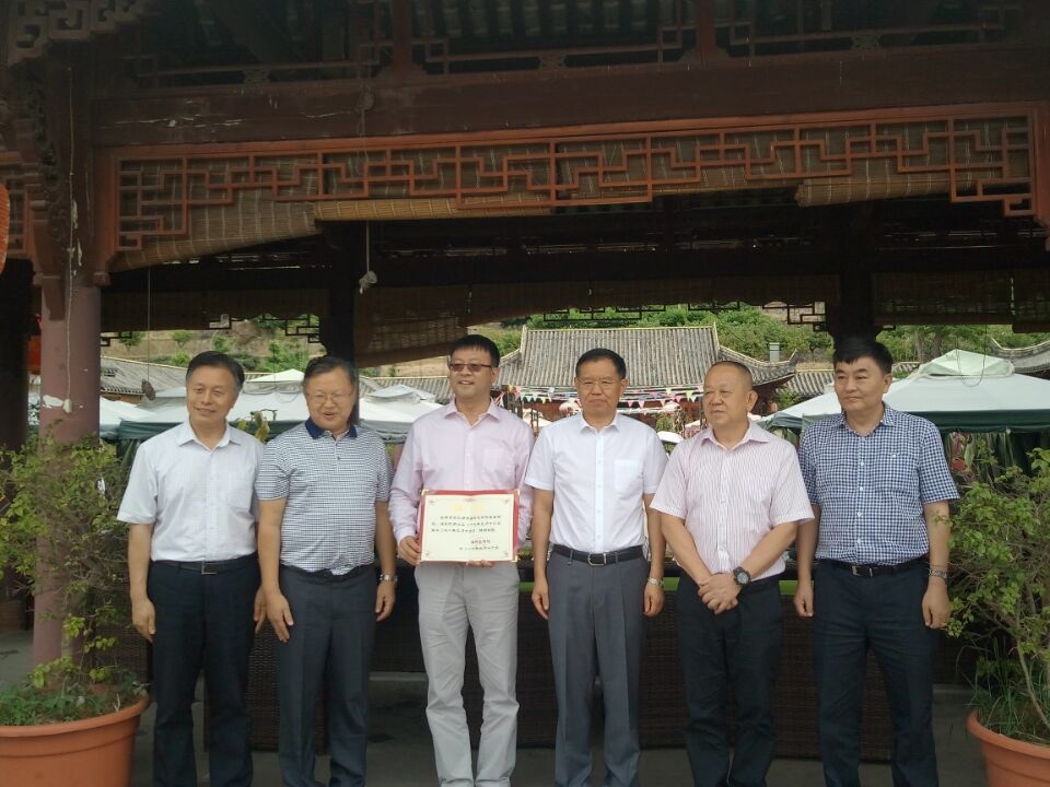 合 影 留 念 (右起:市委常委、常务副市长沈钧,校党委书记肖立军,市委书记李建勤,客座教授宋剑勇,市东区区委书记罗军,校党委副书记、校长王曙光) |