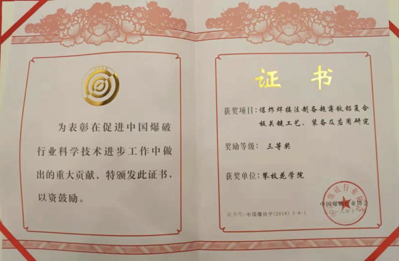 11月8日,中国爆破行业协会在北京隆重举行中爆协第九届科学技术颁奖大会。我校黄平、吴恩辉、张远、李军等师生团队的研究项目,《爆炸焊接法制备超薄钛铝复合板关键工艺、装备及应用研究》,获中国爆破行业协会科学技术进步三等奖。该项目得到了谢先启院士为组长的专家组“国际先进”的评价,通过了汪旭光院士牵头组织的中国爆破行业协会22位专家的获奖评审。该项目共五项专利,主要利用发明的化工产品制备钛铝复合材料,并将该复合材料制备手机边框等产品。