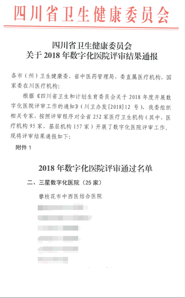 近日,在四川省卫生健康委关于《2018年度数字化医院评审结果》的通报中,我校附属医院被评为三星数字化医院,这是继被省卫健委评为“发挥信息优势”示范医院、中国管理全球论坛“互联网+医疗健康最佳建设奖”之后,附属医院在信息建设领域上的又一殊荣。