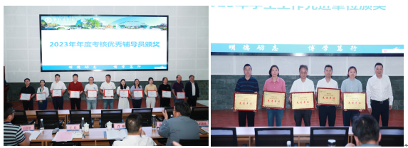 会议还为经济与管理学院、钒钛学院、电气信息工程学院、基础医学院、文学院5个2023年度学生工作先进单位颁奖,为郭新年等12名年度考核优秀辅导员颁发证书。