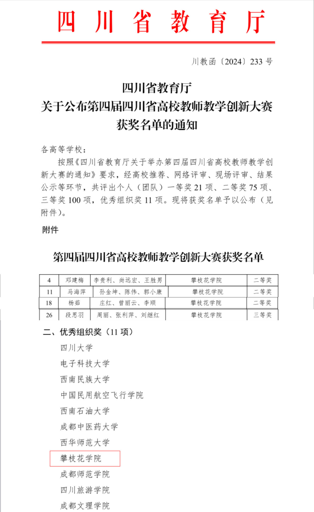 近日,由四川省教育厅主办、四川省高等教育学会承办的第四届四川省普通本科高校教师教学创新大赛圆满落幕。我校生物与化学工程学院邓建梅及其团队、土木与建筑工程学院杨茹及其团队、马海萍及其团队分别荣获二等奖,康养学院段思羽及其团队荣获三等奖。我校首次在二等奖上有所突破,获奖数量和质量创历史新高,学校还获评了优秀组织奖。