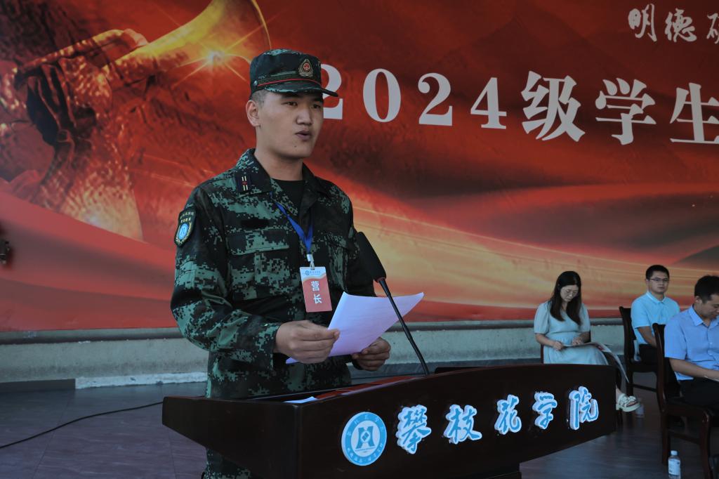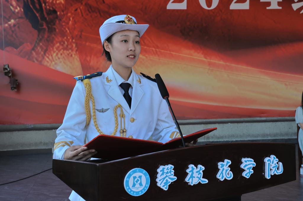 优秀连级指导员智能制造学院程麒铭老师代表师生感谢在军训期间给予关怀和支持的领导、教官和志愿者们。她希望同学们把军训中培养的爱国情怀、团队意识、纪律意识和运动习惯转化为学习的动力和生活的指南,传承并发扬攀大人自律、自觉、自强的精神,勇于拼搏,敢于担当,在攀枝花学院这片沃土上,用青春和汗水书写属于自己的辉煌篇章。