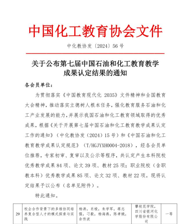 近日,中国化工教育协会发布了《关于公布第七届中国石油和化工教育教学成果认定结果的通知》(中化教协发〔202456号),由我校和四川省银河化学股份有限公司联合申报的教学成果《校企合作背景下的多维协同培养复合型人才的模式探索与实践》荣获一等奖。