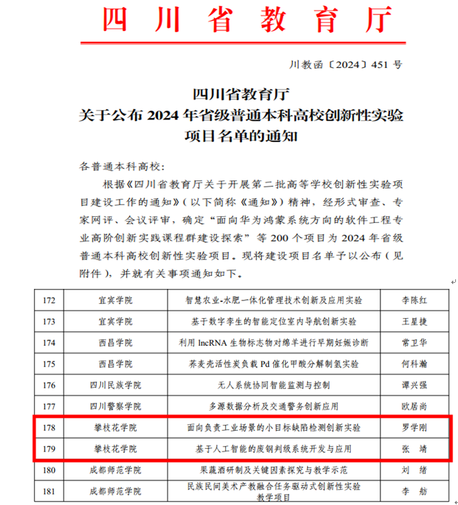 近日,省教育厅公布了2024年省级高等学校创新性试验项目立项名单,我校张靖教授主持申报的《基于人工智能的废钢判级系统开发与应用》、罗学刚教授主持申报的《面向负责工业场景的小目标缺陷检测创新实验》获批立项。