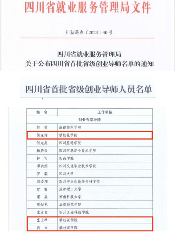 11月14日,四川省就业服务管理局公布了四川省首批省级创业导师名单,我校侯亚辉、张士举、肖玄三位教师入选,这是对我校创新创业教育成效的充分肯定。