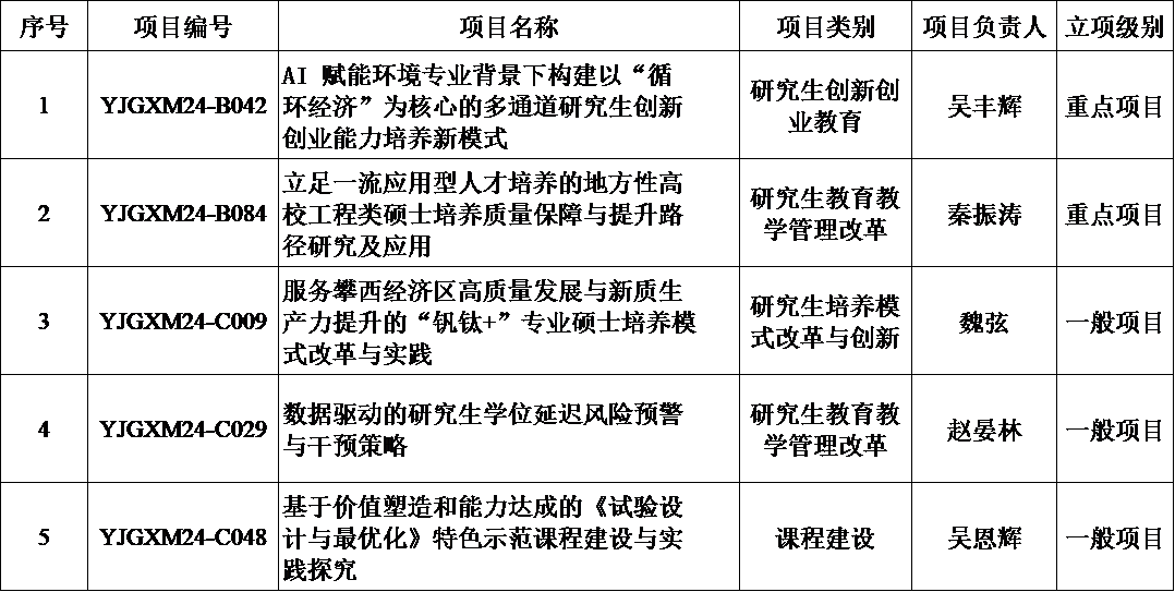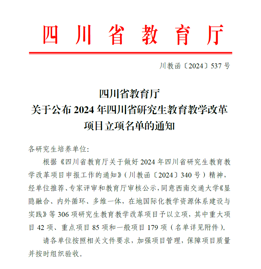 近日,四川省教育厅公布2024年省研究生教育教学改革项目立项名单,我校5项教研教改项目获批立项,其中重点项目2项、一般项目3项,学校获批省级研究生教育教学改革研究项目工作取得突破。