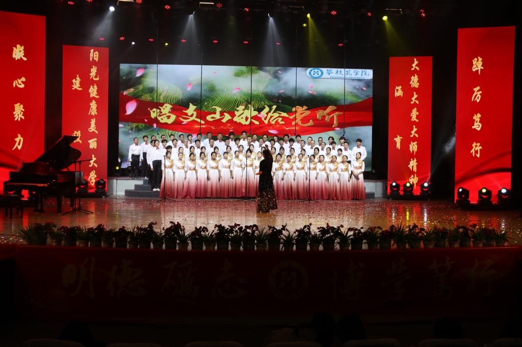 大学生艺术团为带来的校歌《这里得天独厚》,承载着全体攀大人共同的记忆和梦想,抒写了每位攀大人不断追求卓越、勇攀高峰的向往。由电气信息工程学院、审计处、人事处、国际教育学院带来的《江山》深情表达了党对人民的深情厚谊以及人民对党的衷心拥护;由附属医院带来的《不忘初心》激励着人们坚守梦想与使命,砥砺前行;由数学与计算机学院带来的《爱永在》传递出温暖与希望,歌颂人间大爱;由土木与建筑工程学院、计划财务处师生带来的《天路》展现了青藏铁路修建的伟大成就,让幸福的歌声传遍四方;由外国语学院、学工部、团委带来的《在灿烂阳光下》描绘了在中国共产党的光辉照耀下,人民生活的美好景象;由钒钛学院带来的《追寻》唱出了对理想信念的执着追求;由智能制造学院、研究生处、科研处、创新创业学院带来的《四渡赤水出奇兵》再现了红军长征途中的英勇智慧;由大学生艺术团带来的《如愿》寄托了对先辈的敬意和对美好生活的向往;由康养学院、公共实验中心、体育部、纪委办带来的《在太行山上》展现了抗日军民的英雄气概;由经济与管理学院、保卫处的《同一首歌》唤起人们对美好回忆的共鸣;由文学院、图书馆、组织部、资产管理处的师生《春天的故事》歌颂了改革开放带来的巨大变化;由基础医学院、办公室、招生就业处带来的《灯火里的中国》描绘了新时代安宁祥和的景象;由艺术学院、宣传部、统战部、发展规划处、教务处带来的《太阳在这里歌唱》赞美了阳光花城的蓬勃生机;由生物与化学工程学院、网络与计算中心、继续教育学院带来的《唱支山歌给党听》倾诉了对党的感恩之情;由法学院、马克思主义学院、工会、产教融合部带来的《光荣与梦想》彰显了为实现梦想而不懈奋斗的决心;由后勤管理处、资产经营公司带来的《祖国不会忘记》歌颂了那些为祖国默默奉献的人们。