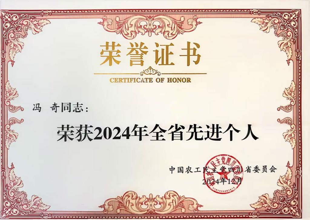近日,在农工党四川省委会十三届四次全体(扩大)会上,农工党攀枝花学院总支荣获“2024年全省先进基层组织”,总支主委冯奇荣获“2024年全省先进个人”荣誉称号。