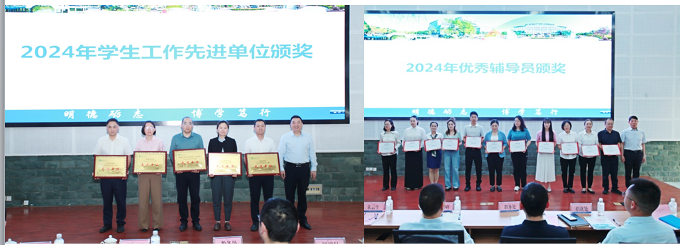 会议为2024年度学生工作先进单位钒钛学院、经管学院、生化学院(农学院)、医学院、外语学院和蔡14名优秀辅导员颁奖。