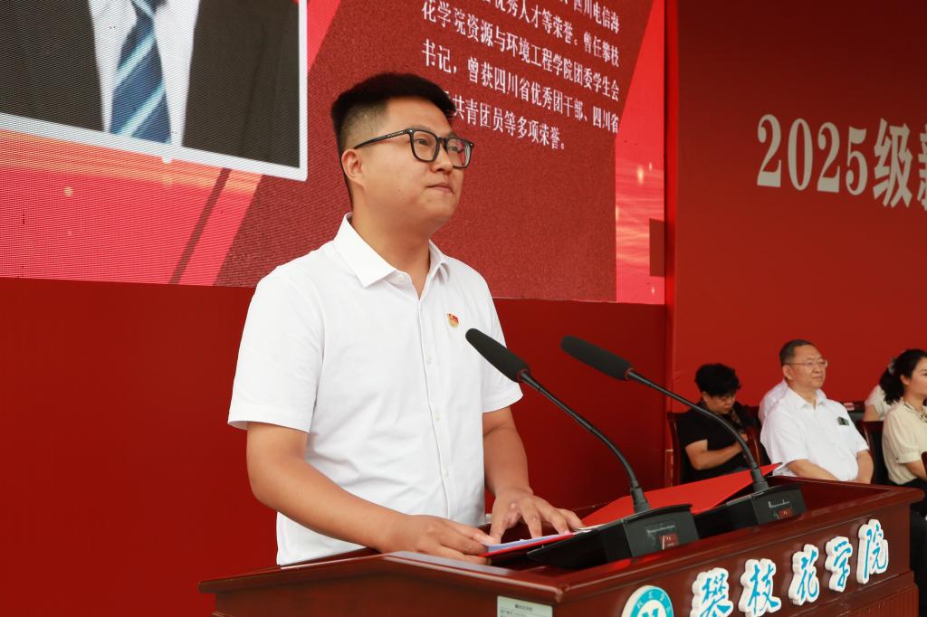 外国语学院2025级英语笔译专业硕士研究生张茜代表新生发言。她表示,作为一名新生将“归零前行、脚踏实地、融入集体、志存高远”,在阳光攀大书写“强国有我”的青春答卷。