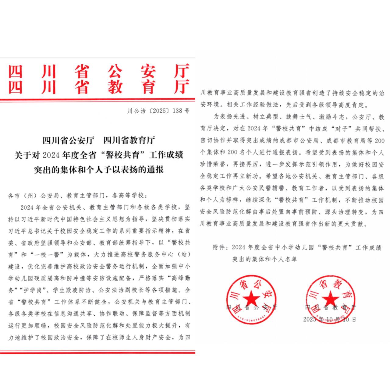 近日,四川省公安厅、四川省教育厅联合下发《关于对2024年度全省“警校共育”工作成绩突出的集体和个人予以表扬的通报》,对在全省“警校共育”工作中作出突出贡献的集体和个人进行表彰。攀枝花学院被评为“成绩突出集体”,学校保卫处综合科科长程桥同志被评为“成绩突出个人”。