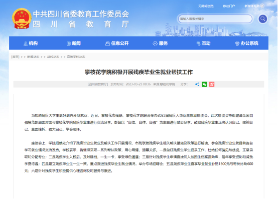 近日,四川省教育厅官网以《攀枝花学院积极开展残疾毕业生就业帮扶工作》为题,报道了我校积极开展残疾人毕业生就业帮扶工作,报道全文如下: