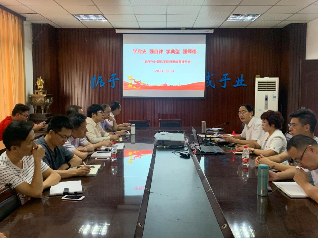 6月30日下午,数计学院召开了“学党史 强自律 学典型 强师德”专题学习教育会。大会特别邀请了身边的典型:全国优秀教育工作者、四川省第十届学术技术带头人、攀枝花市职业道德 “十佳”标兵、密地外国语学校执行校长李美文专题报告。学院全体教师参加了报告会。