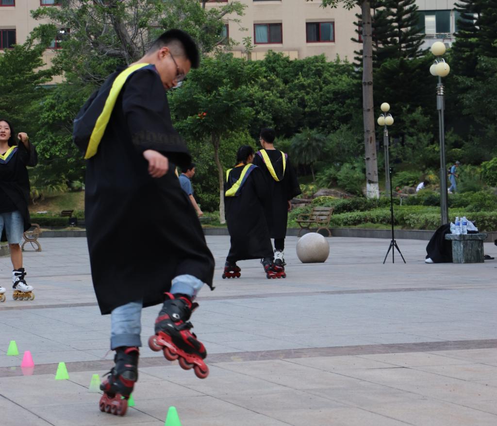 他与轮滑的相遇,源自一次傍晚的校园散步,平日繁杂学业带来的困扰促使他想接触一些“新事物”来释放心中的压力。可能是天赋使然,他很快便掌握了轮滑的要领,渐渐地,C教之上出现了一道靓丽的身影,轮滑鞋如同双腿的延伸,在多变的地形上如履平地。他说:“人人都应有一种深厚的兴趣或爱好,以丰富心灵,为生活添加滋味”。他选择了这项爱好,并全心全意的投入到当中,丰富了自己的生活,也增添了一丝不可多得的趣味。