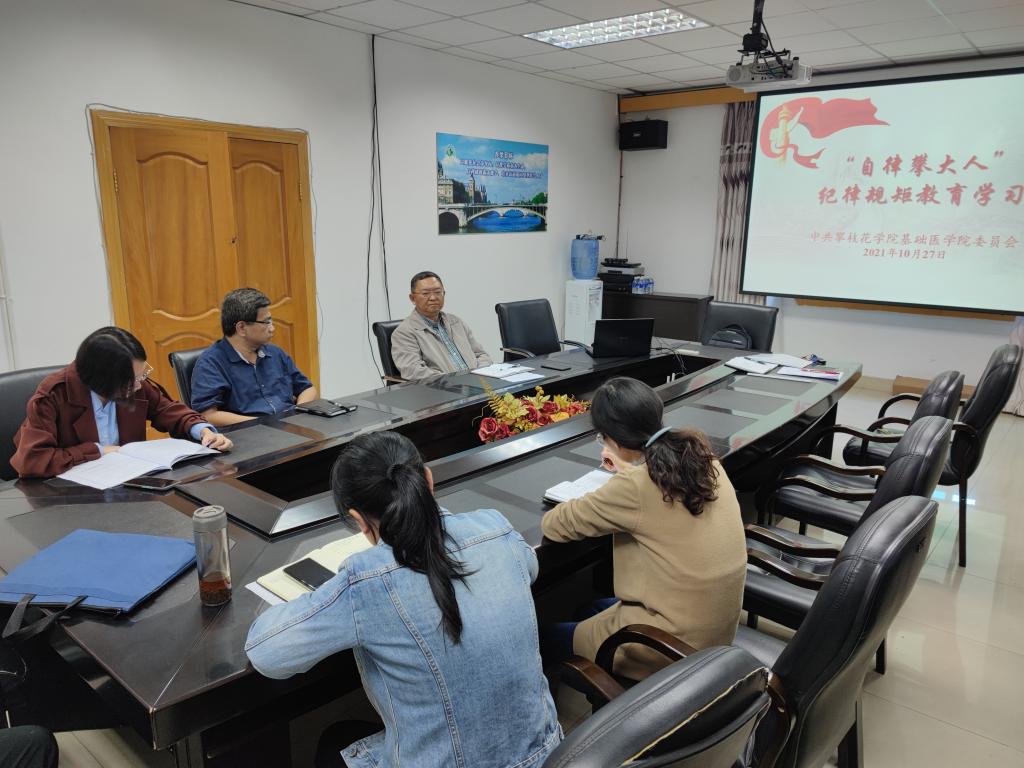 10月27日下午,基础医学院在西苑三楼大会议室组织开展自律攀大人纪律规矩教育活动,会议由学院党委相关负责人主持,全体教职工参加集体学习。