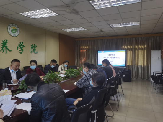 会上学习了党的十九届六中全会精神,重点学习了中国共产党百年奋斗重大成就和历史经验。会上,学院党总支相关负责人强调,全院教职工要以史为鉴,不忘初心,牢记使命,要进一步增强“四个意识”,坚定“四个自信”,做到“两个维护”,学习宣传贯彻全会精神,要适应新时代,融入新发展,弘扬党的精神,赓续红色血脉,以全会精神为指导,切实把思想和行动相统一,做好康养这篇文章,服务学院和学校发展,打造康养文化,促进校园品牌建设。