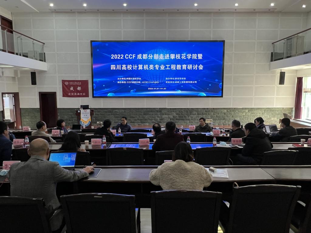 1月22日,2022CCF成都分部走进攀枝花学院暨四川高校计算机类专业工程教育研讨会在我校顺利召开。副校长张旭辉、国内计算机行业知名专家洪玫、彭舰、周世杰教授以及川内高校相关专业专家、骨干教师出席会议,数计学院行政负责人及骨干教师参会。