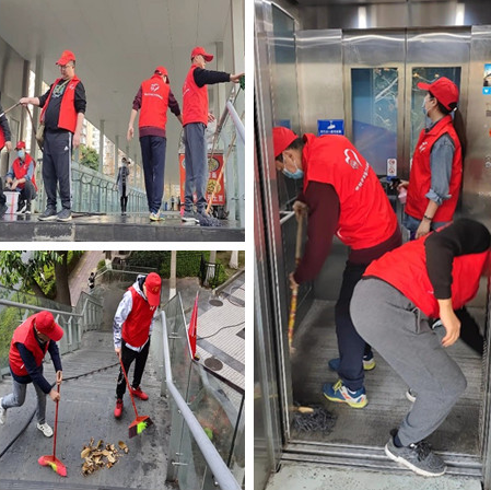 在学校第一教学楼、图书馆、分测中心、秀园、万达广场人行过街天桥等区域,队员们有的清扫落叶,有的清理沟渠,有的清除牛皮癣,有的打捞喷泉池杂物,有的擦拭电梯、扶手,有的检查维修直饮水机等公共设施,有的装运垃圾,干得热火朝天、不亦乐乎。在大家的共同努力下,沟渠、路面、轿厢、池水等很快被清扫擦拭清理干净,焕然一新。劳动现场那一抹抹红色马甲和帽子俨然成为自律后勤一道靓丽的风景线,过往师生和市民纷纷竖起大拇指。