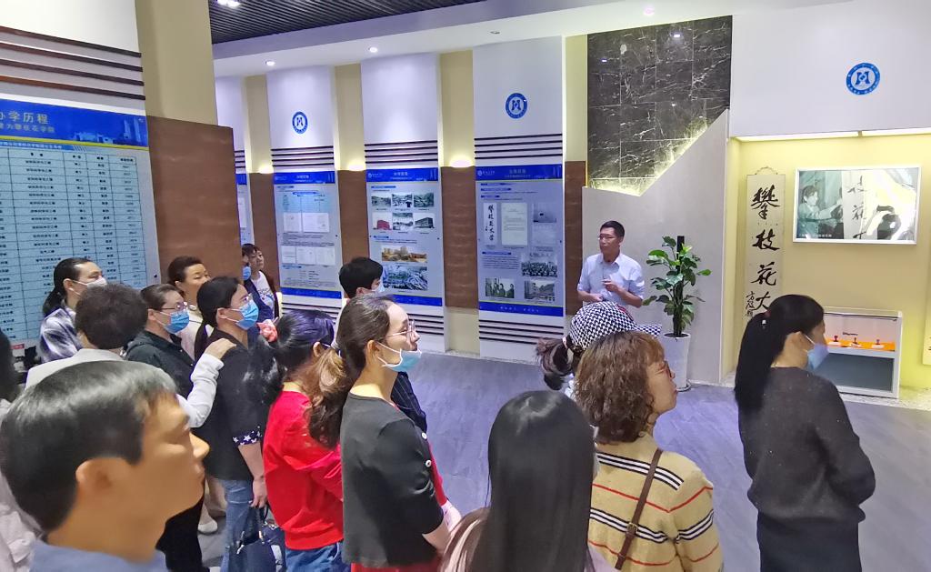 王欢向在场人员生动的回顾了学校的发展奋斗史。讲解从建校之初的短期职业大学到普通专科学校,从地方本科大学到获批硕士学位授予单位,全面开启建设应用型一流大学新征程。学校从无到有、从小到大,办学层次和办学水平实现了一次又一次跨越式发展,办学成就和办学效益也不断得到社会各界的认可和赞许。奋斗路上的那些重大事件、精彩瞬间和感人故事,通过王欢的讲解再一次呈现在大家面前,大家一边仔细聆听,一边驻足观看。