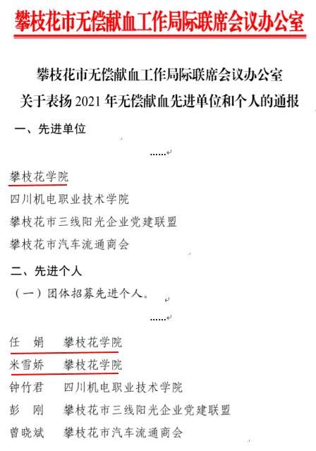 近日,攀枝花市无偿献血工作局际联席会议办公室发布《关于表扬2021年无偿献血先进单位和个人的通报》,对全市22家单位和28名个人进行通报表扬。我校获评为“先进单位”,医学院党委副书记任娟、2020级临床医学专业学生米雪皎获评“先进个人”。