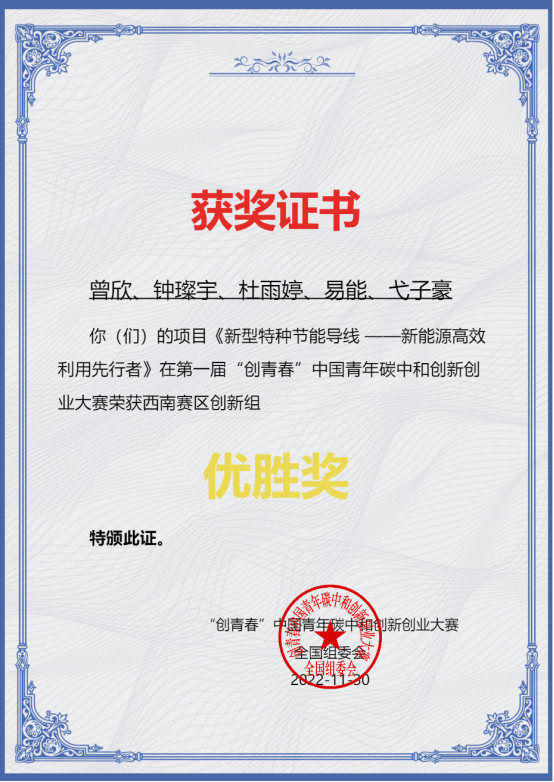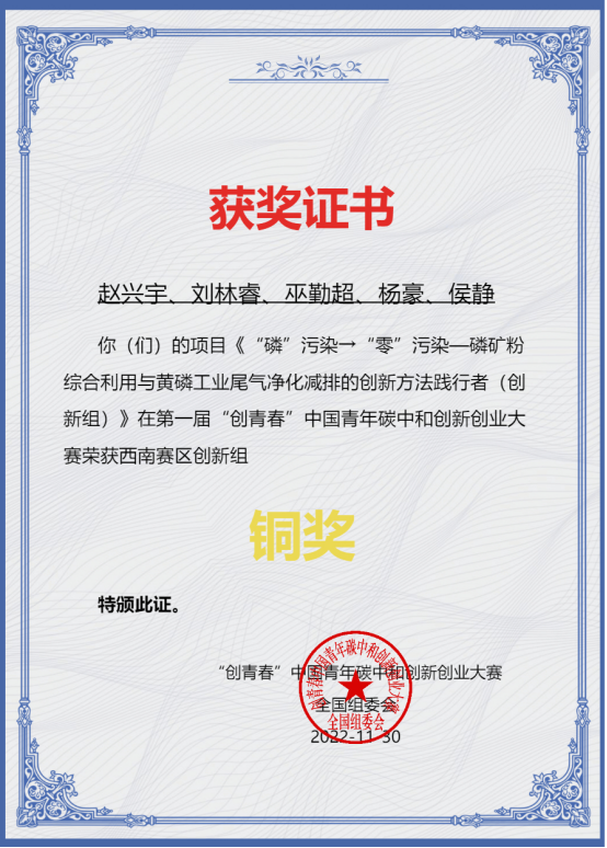 第一届“创青春”中国青年碳中和创新创业大赛于12月初评审结束,我院新能源科学与工程、冶金工程专业的刘源裴、梁俊杰、许平、赵兴宇、曾欣等学生在指导教师张士举、徐众、侯静和钟璨宇的带领下,斩获西南赛区创新组银奖1项、铜奖3项、优胜奖1项。