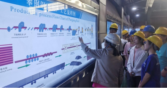 在生产现场,同学们参观学习“象牙微雕钢城”的建造历程、轨梁的“品牌故事”以及钢轨从钢坯到钢轨成型的整个流程,见证百米钢轨7分钟铸就下线的“中国速度”。