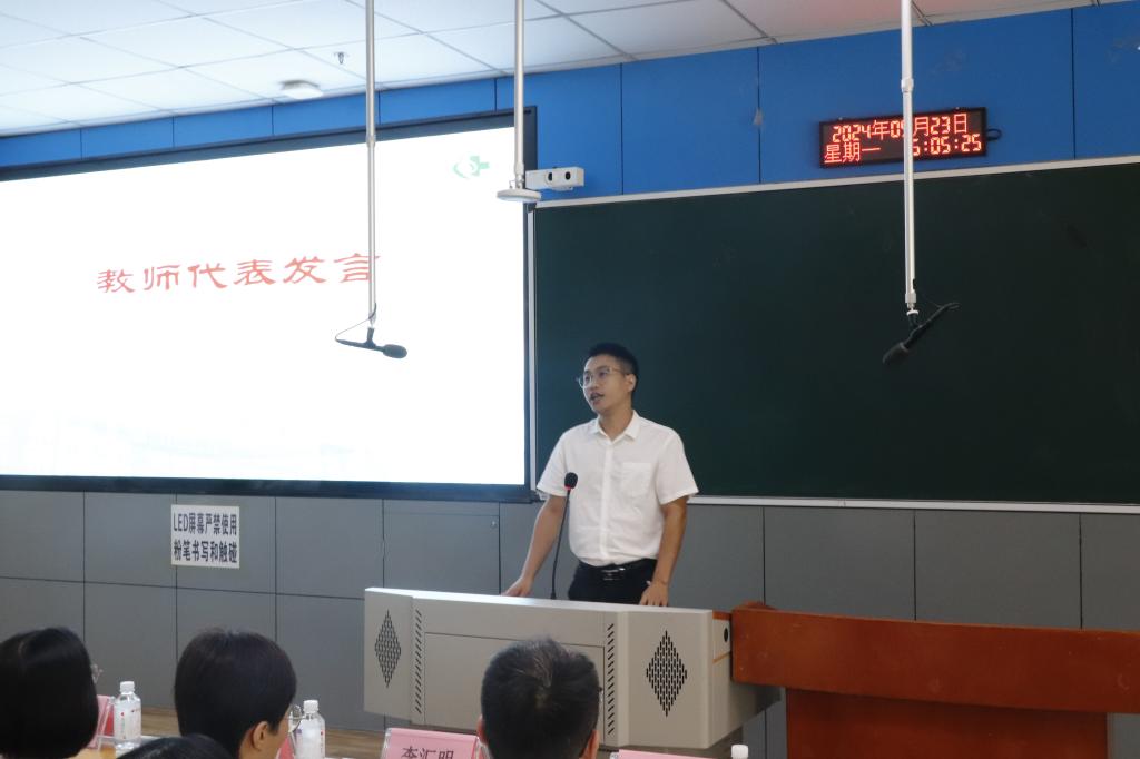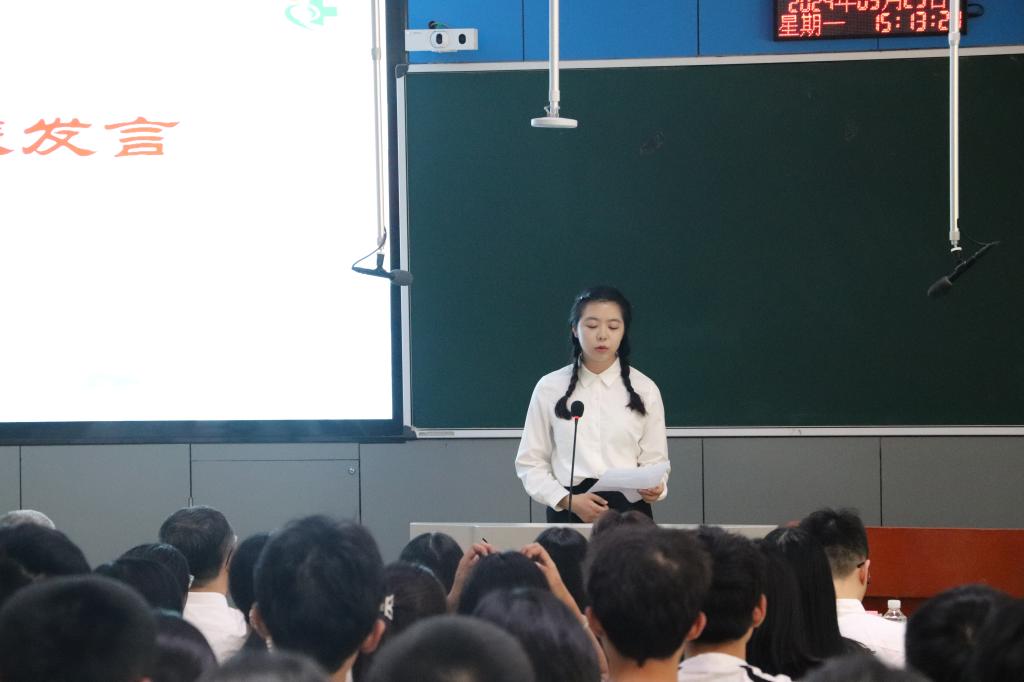 教师代表栗楠上台发言。他结合自己的教学经历,分享了医学专业的独特魅力和价值所在,强调了医学教育对于培养未来医生的重要性。同时寄语新生,要勤奋学习,勇于担当,为实现自己的人生理想而不懈奋斗。
