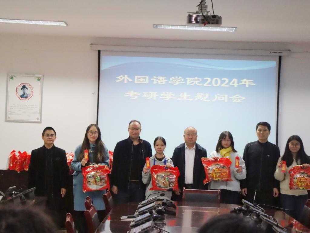 会议开场,高朝阳简要介绍了本次会议目的,并代表外国语学院向所有备战考研学生表达了诚挚的祝福与期待。随后,在付乔书记带领下,各位考研学子依次上台领取学院精心准备的慰问品和祝福卡片。面对这份来自母校的关怀,大家脸上洋溢着幸福的笑容,纷纷表达了对学院及老师们长期以来给予帮助和支持的感激之情。此次慰问会让外院学子们深切感受到了家的温暖,进一步加深了外国语学院师生感情。会议最后,全体参会人员合影留念,用镜头定格下这难忘而美好的时刻。