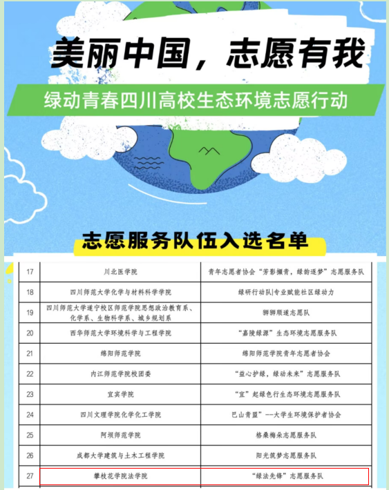 近日,在“美丽中国,志愿有我——绿动青春四川高校生态环境志愿行动”公布的入选名单,法学院“绿法先锋”志愿者服务队成功入选。