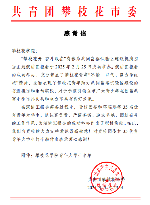 近日,共青团攀枝花市委向我校发来了一封感谢信,感谢我校团委和蒋瑶瑶等35名优秀青年大学生在2月25日举行的“攀枝花开 奋斗我在”青春为共同富裕试验区建设挺膺担当主题演讲汇报会筹备过程中以认真负责、严谨务实、追求卓越、团结奋斗的工作作风,为演讲汇报会的成功举办作出了积极贡献。