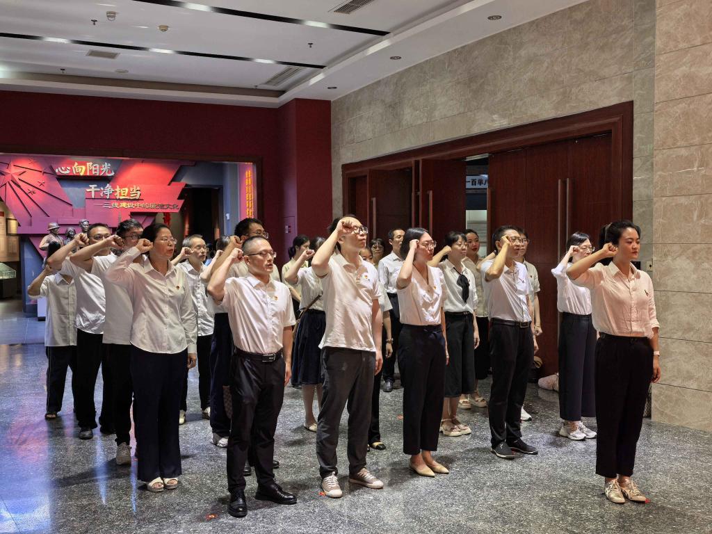 6月27日下午,党委书记王鹃带领教师党员参观中国三线建设博物馆,她带领全体同志面向鲜红的党旗,紧握右拳,重温入党誓词。誓言铿锵,党员教师们立志把“不忘初心、牢记使命”作为教书育人终身课题。