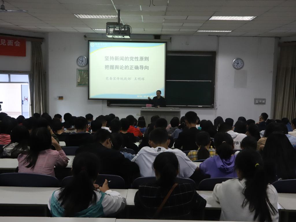 | 宣传统战部部长王明辉老师为培训讲授了第一课《新闻的党性》 |