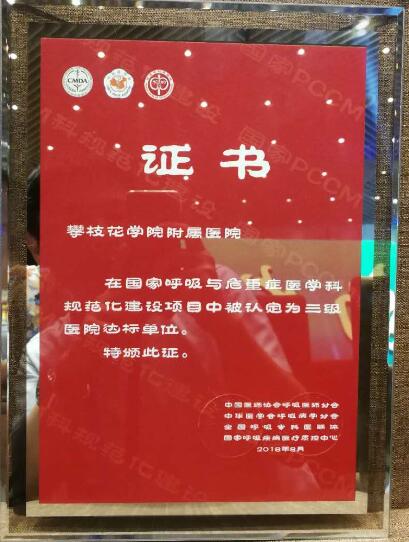 2018年4月,攀枝花学院附属医院申请进行PCCM规范化建设评定,2018年8月20日,接受了由第三军医大学新桥医院副院长徐剑铖教授、重庆市中山医院呼吸内科主任黄勇教授组成的PCCM考评专家组的实地认证工作。专家组听取了我院PCCM科规范化建设情况汇报,深入我院呼吸与危重症医学科三个病区、RICU、肺功能室、睡眠呼吸疾病诊疗室及呼吸专科门诊等功能区域,对PCCM科相关知识与技能的应知应会、GOLD指南的学习培训、患者吸入装置使用、用药依从性、长期随访、医护配合情况、无创呼吸机操作、护士危急值报告处理、雾化吸入药物、患者教育与指导等进行全面考核。在反馈中,专家组对我院PCCM科规范化建设取得的成绩予以了充分的肯定和高度的评价。经过国家各级专家的层层严格审核,最终荣获了由中国医师协会呼吸医师分会、中华医学会呼吸病学分会、全国呼吸专科医联体、国家呼吸疾病质量控制中心共同授予的“国家呼吸与危重症医学科第二批PCCM规范化建设三级医院达标单位”。