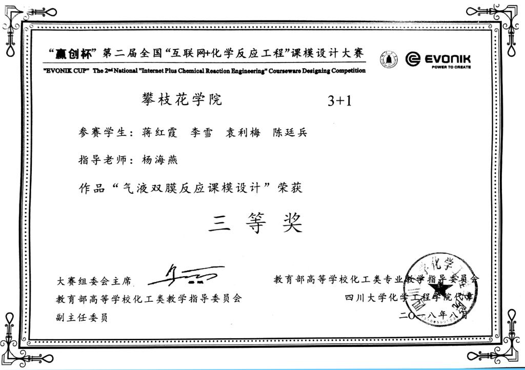 2018年“赢创杯”第二届全国“互联网+化学反应工程”课模设计大赛传来喜报,我校生化学院蒋红霞、李雪、袁利梅和陈廷兵等同学组成的“3+1”参赛队伍(指导老师:杨海燕)荣获全国三等奖。