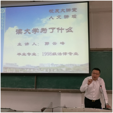11月10-13日,由校友总会主办,校友工作志愿者协会承办的“慨叹青春年华,畅说明日辉煌”校友大讲堂系列活动在我校陆续举行。郭云峰、邓鉴鑫、栾伟鹏、何大川、胡地梅五名校友分别担任了本次校友大讲堂系列活动的主讲人。