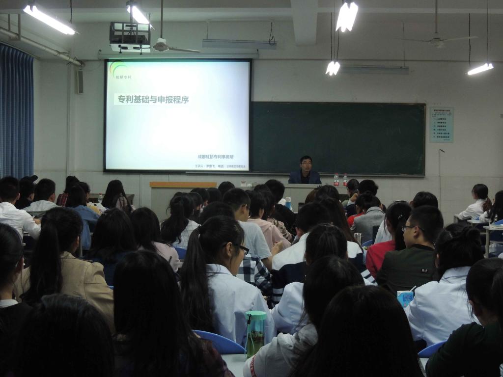 为学生 参加 第四届“挑战杯”大学生课外学术科技竞赛提供必要的课外专业知识储备,3月7日晚,医学院邀请成都虹桥专利事务所攀枝花办事处主任黄贵飞 做客 “杏林讲堂” ,为 医学院200余 师生开展了题为《专利基础和申报程序》的讲座。