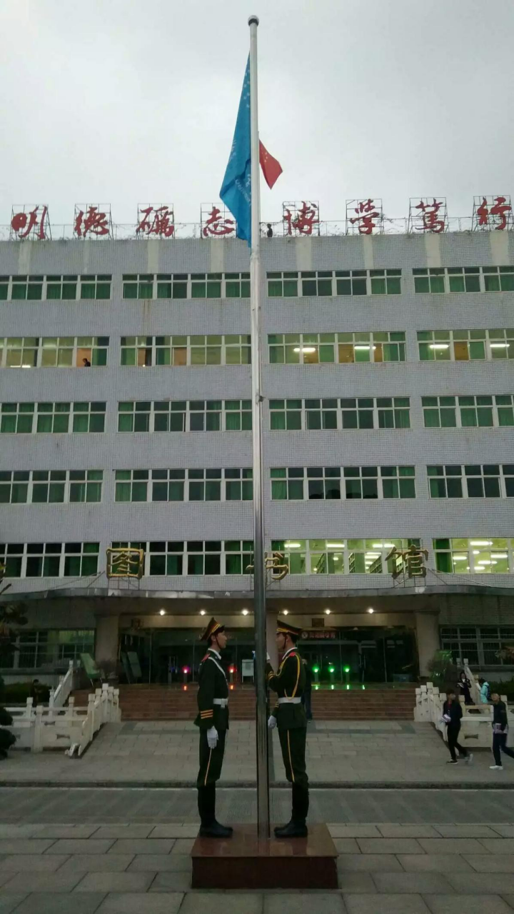 7点40分,伴随着激昂的国歌响起升旗仪式正式开始。迎着朝阳,学校国旗护卫队成员迈着坚定的步伐来到国旗台下,全场一片肃静。在激昂的《义勇军进行曲》中,升旗手振臂一挥,鲜艳的五星红旗徐徐升起紧接着,校园之歌响起,校旗、院旗同时升起。