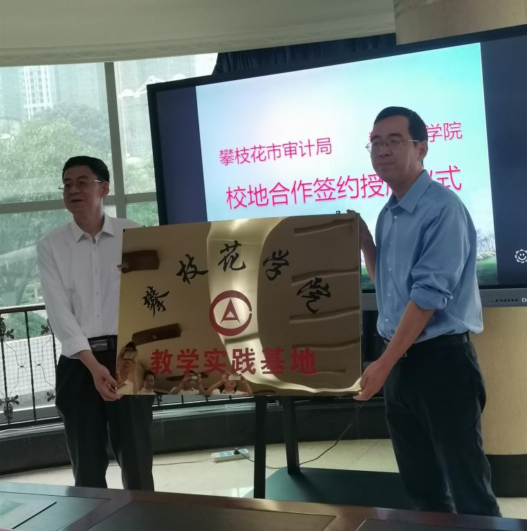 签约仪式上,张旭辉代表学校对攀枝花市审计局长期以来对我校人才培养、学术科研、师资队伍建设等工作的支持与帮助表示衷心的感谢。王玖斌局长回顾了学校与市局前期合作的成果,并介绍了教学实践基地前期建设情况。与会人员就校地合作相关工作进行了深入交流和热烈讨论。双方均表示,协议的签署开启了校地合作的新阶段,双方将进一步深化沟通交流,细化落实合好作协议中的各项任务。张旭辉副校长和王玖斌局长共同签署了校地合作协议书,并为教学实践基地揭牌。