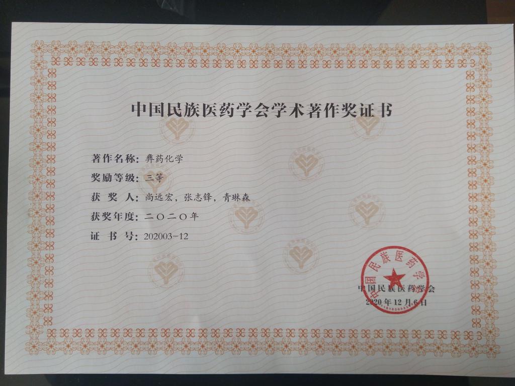 12月6日,中国民族医药学会主办的2020 年度科学技术奖、学术著作奖颁奖大会在北京市召开,现场颁发了2020 年度中国民族医药学会学术著作奖。我校生化学院尚远宏副教授主编的《彝药化学》荣获三等奖。