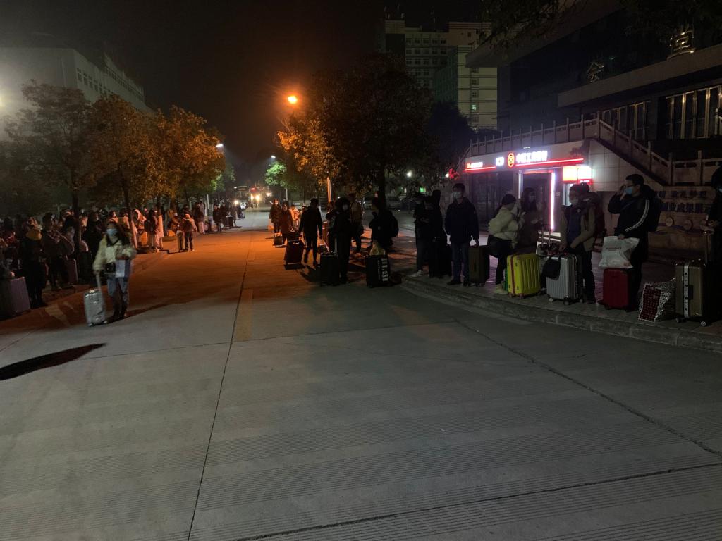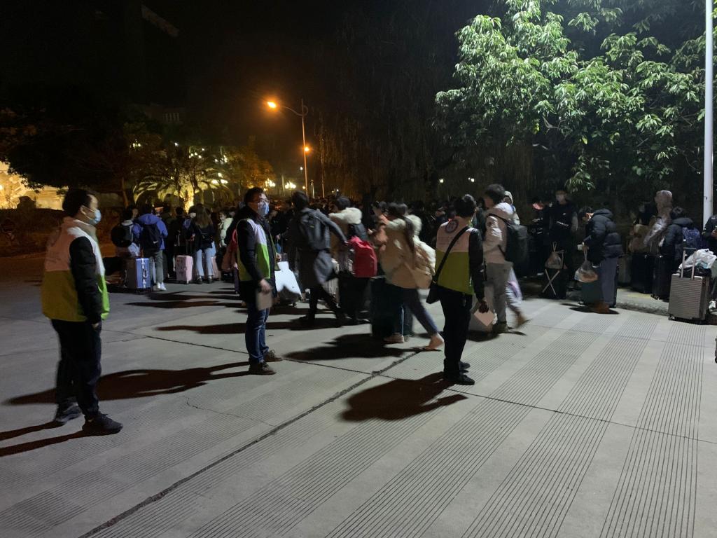 113日是学生离校返乡的高峰期,共有近100辆车辆进校接送学生。为了有序组织学生安全离校,副校长石维富带队,学工部(处)、保卫处、招就处以及各二级学院的老师组成的志愿者来到静明湖畔的上车点开展志愿服务工作。冬季的清晨,气温降至1度,寒风中老师们按照计划到达各自工作点,为学生引路以便于学生正确乘车;贴心准备了防疫物资,提供给忘记携带口罩的学生,叮嘱他们返乡途中注意个人防护;指挥交通和组织学生有序排队候车,避免拥挤和混乱……截至13日上午9时,校园定制返乡直通车共发车63趟次,共运送学生2926人次;校园直达火车南站定制公交车共发车85趟次,共运送学生2500余人次;市客运中心转运车辆进校共发车5趟次,共运送学生200余人次。